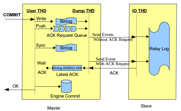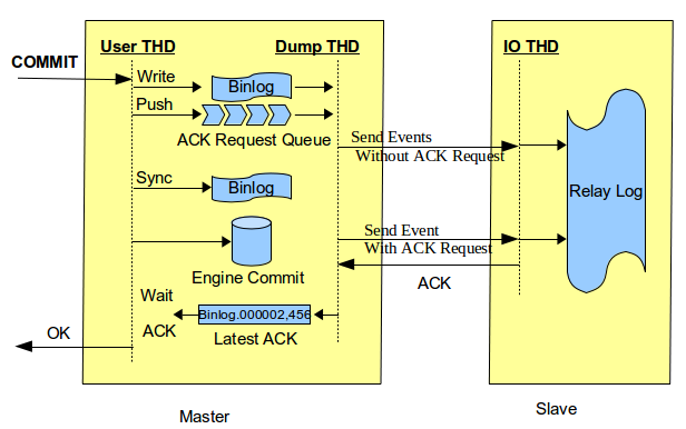Client Commit -> Binlog Flush/Commit -> Binlog dump Send Event with ACK Request -> Record Relay Log -> ACK -> Engine Commit -> Client Commit OK Response