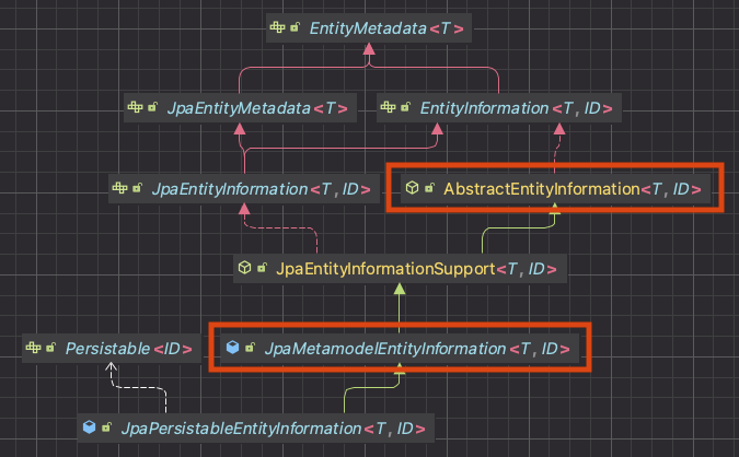 JpaEntityInformation 인터페이스의 다이어그램이며, JpaMetamodelEntityInformation과 AbstractEntityInformation의 isNew() 메서드가 동작한다.