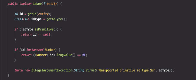 @Version이 사용된 필드가 primitive 타입이면 AbstractEntityInformation의isNew()를 호출한다. @Version이 사용된 필드가 wrapper class이면 null인지 확인한다.