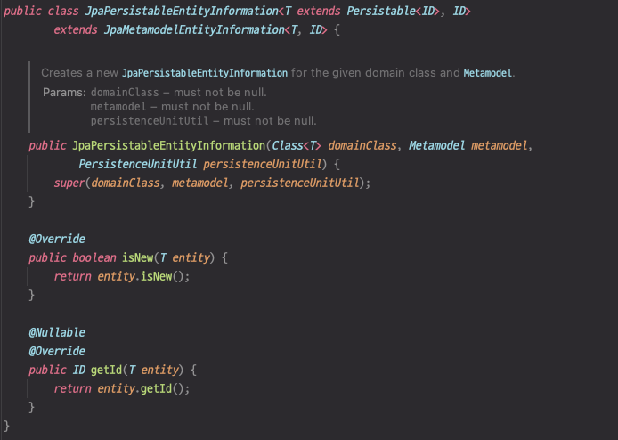 엔티티에서 Persistable<T> 인터페이스를 구현하면 SimpleJpaRepository의 JpaEntityInformation를 JpaPersistableEntityInformation으로 주입하게 된다.