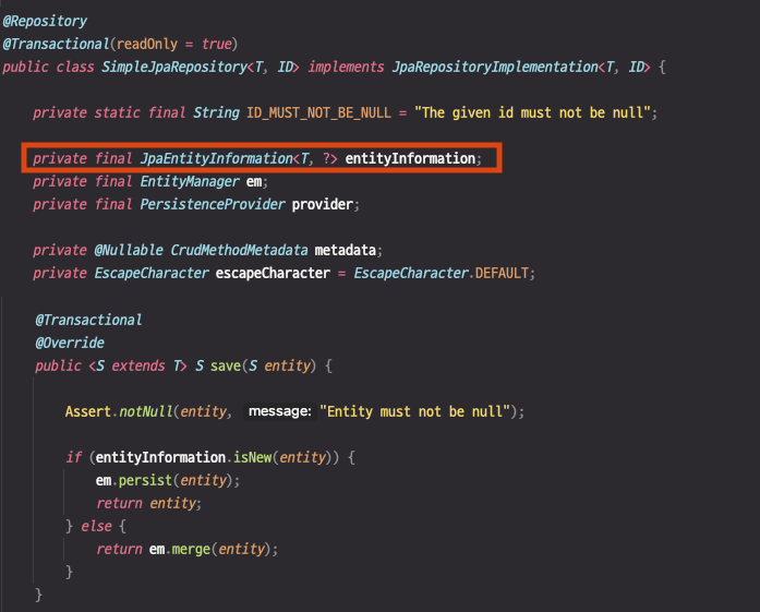 원인을 파악하기 위해 save()의 동작 방식을 살펴보았다.save() 메서드는 JpaRepository의 구현체인 SimpleJpaRepository 클래스에 구현되어 있다.