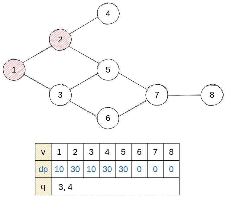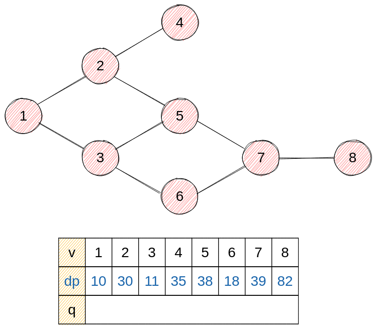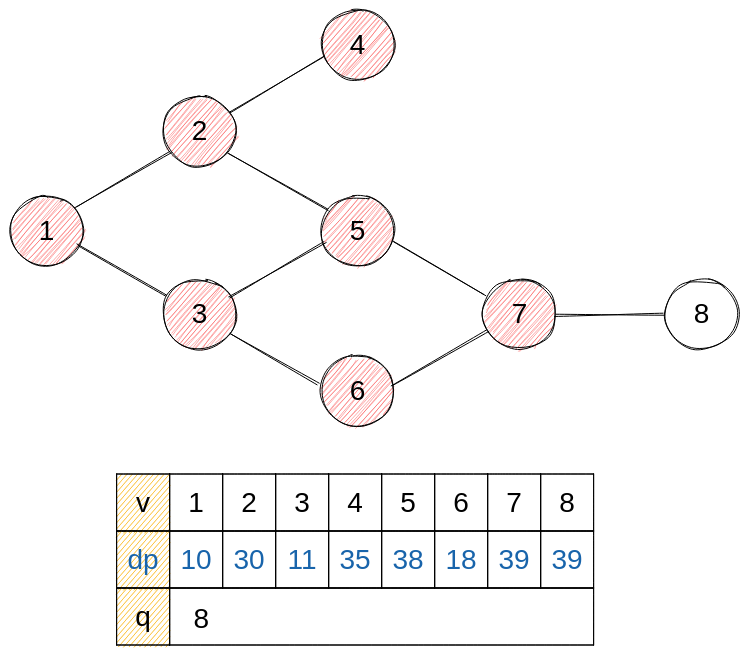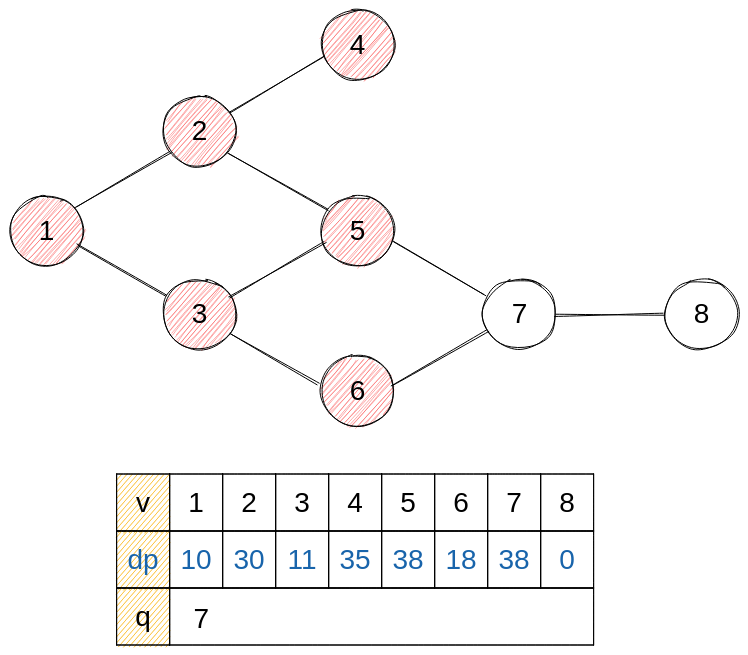 - next = 8 : dp에 7의 건설 시간을 저장하고, 진입 차수가 0이 되어 큐에 삽입한다.
