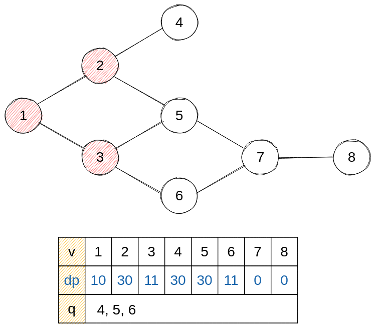 - next = 5, 6 : 5는 2의 건설 시간이 더 크므로 3의 건설 시간을 저장하지 않고 6은 dp에 3의 건설 시간을 저장한다. 5, 6 모두 진입 차수가 0이 되어 큐에 삽입한다.