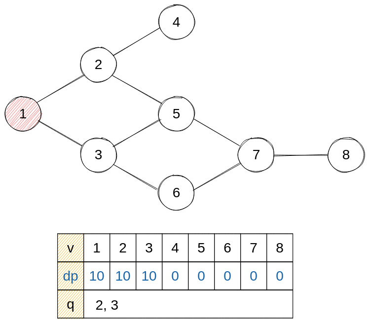 - next = 2, 3 : dp에 1의 건설 시간을 저장하고, 진입 차수가 0이 되어 큐에 삽입한다.
