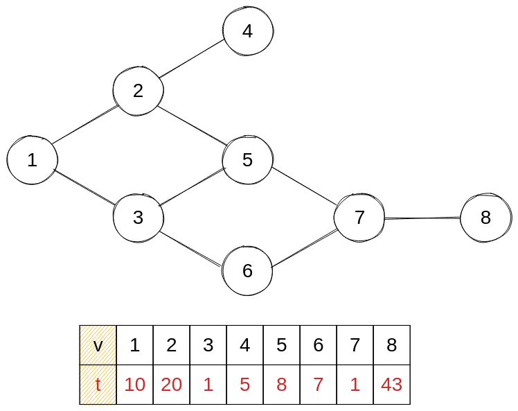 - now = 8 : dp에 자신의 건설 시간(43)을 더한다.