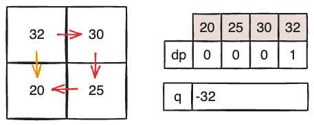 heappush(q, (-board[0][0], 0, 0)) # (1)
