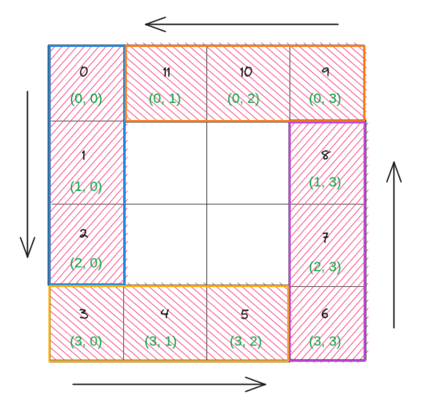 (x, y)는(i , i)이다. (i , i)부터 반시계 방향으로 i번째 계층의 값을 큐에 삽입한다.- 큐를 r만큼 회전한 후 큐에서 값을 삭제하면서