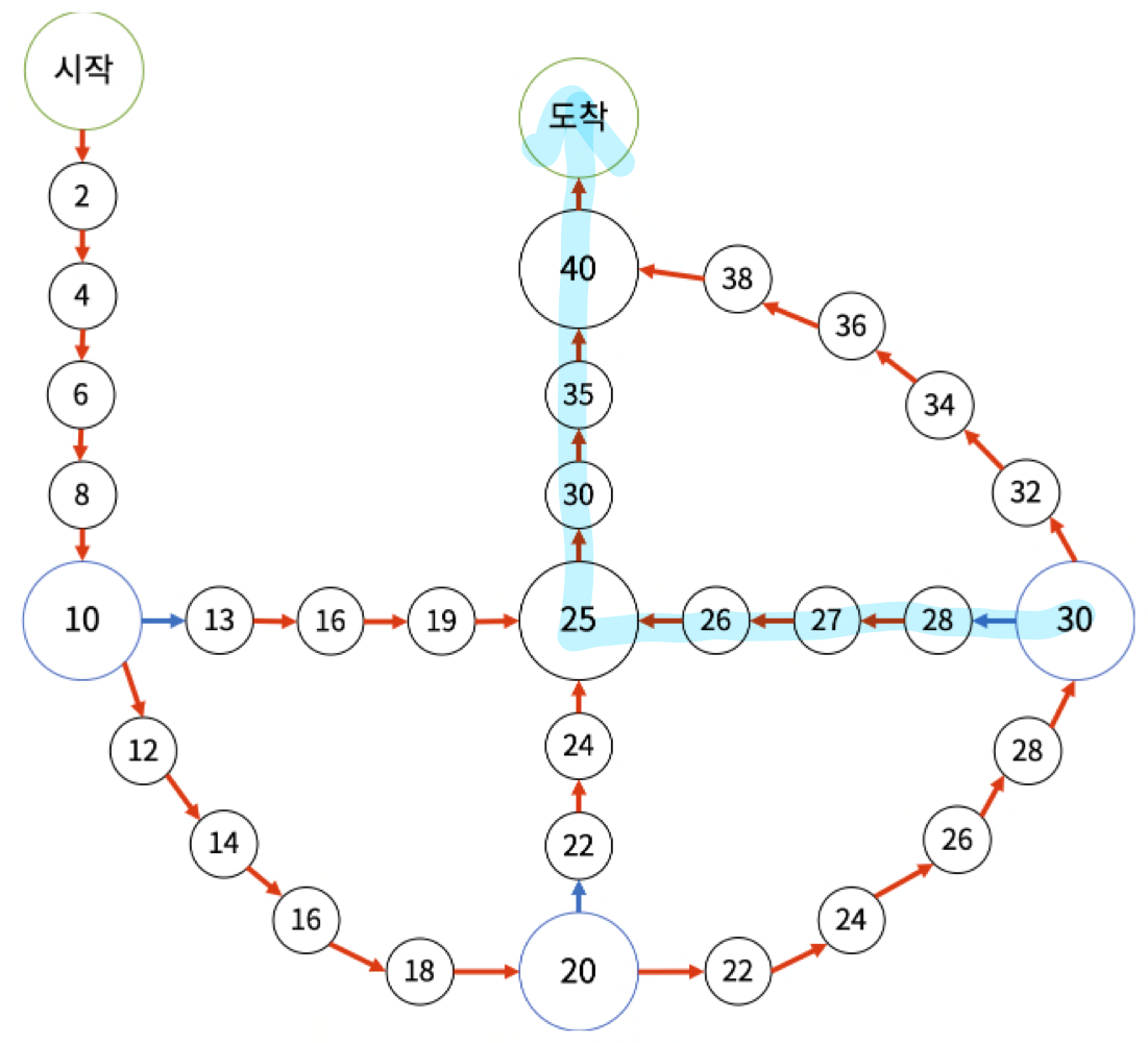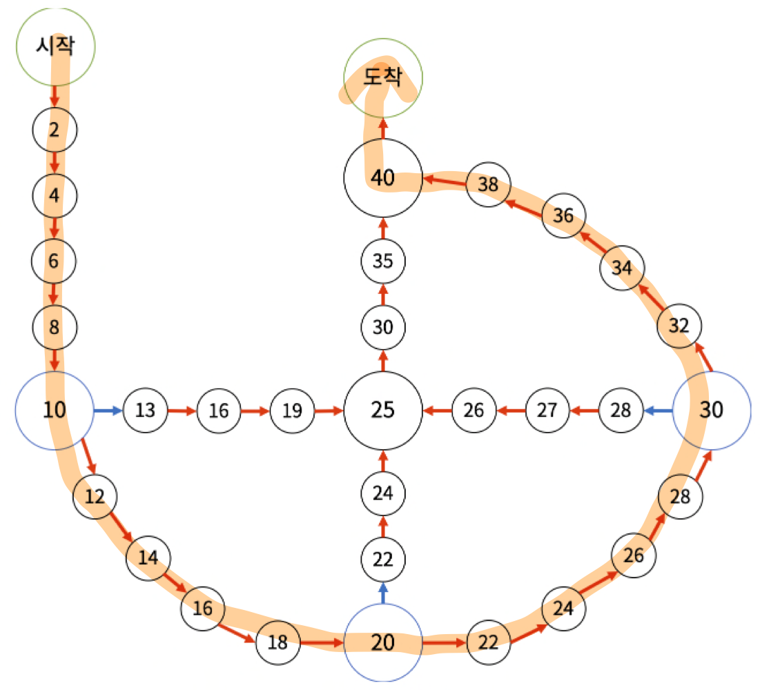 r == 1 or 2 or 3이고 점수가 5의 배수(25, 30, 35)일 경우 board의(5, 점수 / 5 - 5)으로 말을 이동한다. - (8) 이동한 칸에 다른 말이 없을 경우 점수를 추가하고 dfs 탐색한다.