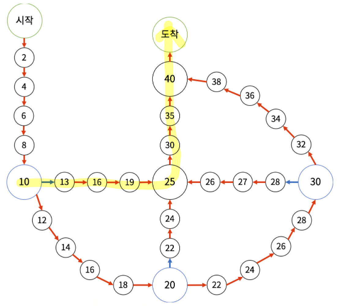 에서 25, 30, 35에 말이 놓였을 때 이동하는 칸이다.- 말이 이동한 좌표에 따라 게임판의 인덱스를 조정하고 dfs 탐색한다.